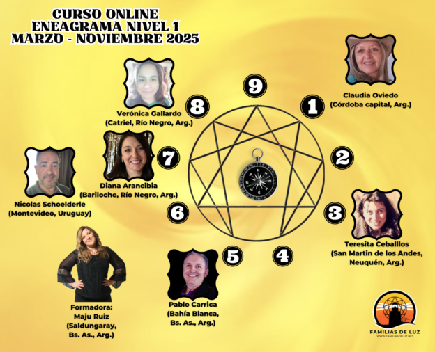 Es un curso orientado a mirarte profundamente… Descubrirás y/o confirmarás tus dones, tus talentos, tus luces, tus sombras, tus miedos… Aprenderás sobre las características de las 9 esencias que encontramos en el Eneagrama y tendrás la posibilidad de reconocerte al interiorizar los diferentes aspectos de cada esencia y de aprender sobre la Dinámica del Eneagrama, es decir cada elemento que encontramos en nuestro mapa personal. En cada encuentro, el Eneagrama te mostrará el camino hacia una mejor versión de tí mismo y de cómo sanar tus vínculos. Es un curso que cada persona puede llevar a su ritmo, absorbiendo lo que necesite para el momento que está transitando en su vida, incluso para complementar otros conocimientos como Coaching, Biodescodificación, Constelaciones Familiares, PNL, etc